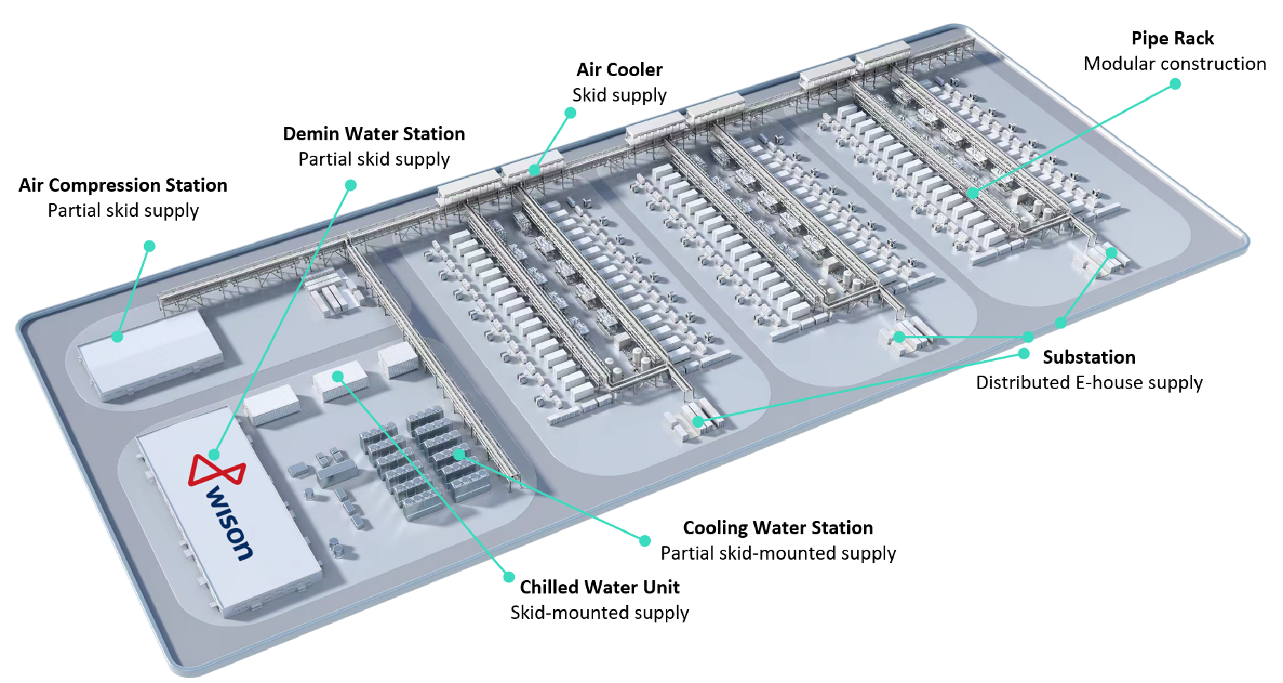 تتمتع "ويسون للهندسة" بقدرات في التخطيط المعياري والبحث والتطوير، مما يمكنها من تحقيق تسليم معياري عالي المستوى لكامل مرافق المصنع. حيث يساهم هذا التسليم المعياري في تقليل تكاليف ووقت الإنشاء في الموقع.