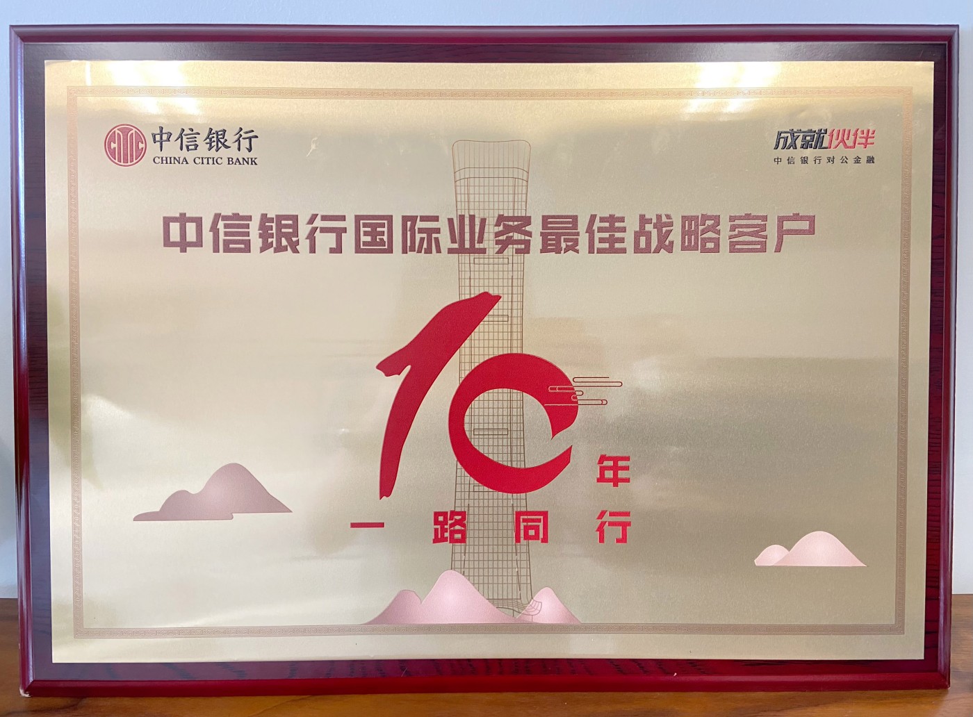 The 10th Anniversary CITIC Bank Best Strategic Client for International Business plaque