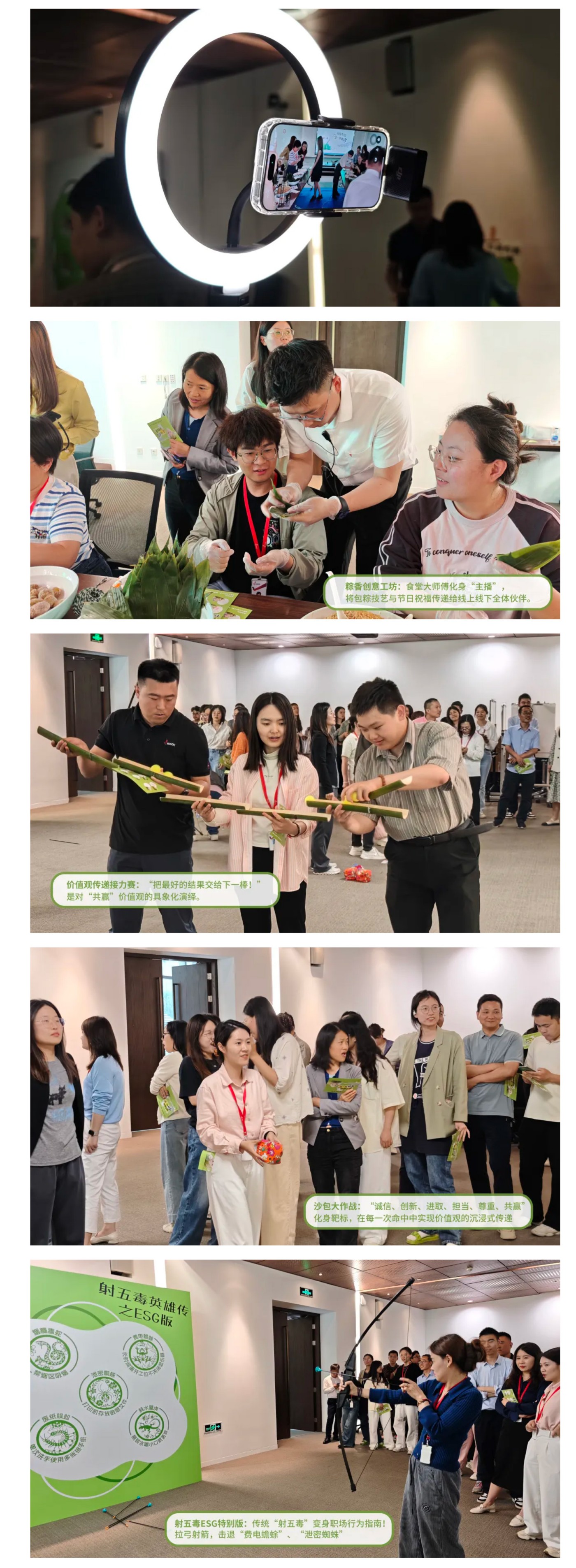 Prior to the event, an employee childhood photo collection initiative captured innocent smiles and heartwarming moments with pets. Each photo's accompanying "Make the World Better" pledge carried understanding and reflections on corporate culture and ESG principles. At the venue, four interactive zones led by corporate culture ambassadors skillfully integrated company values and ESG concepts into traditional games. In the Zongzi Workshop, canteen masters became "livestream”host, teaching zongzi-making techniques that brought Dragon Boat Festival traditions to life. The Bamboo Tube Relay exemplified the "win-win" philosophy through team collaboration. The Beanbag Toss game embedded six core values - "integrity, innovation, entrepreneurship, responsibility, respect, and win-win" - through friendly competition. The innovative "Shooting Five Toxins" ESG edition conveyed environmental protection, energy conservation, and information security principles. The event concluded with special prizes infused with corporate culture elements, allowing every participant to depart with warm memories and profound experiences.
