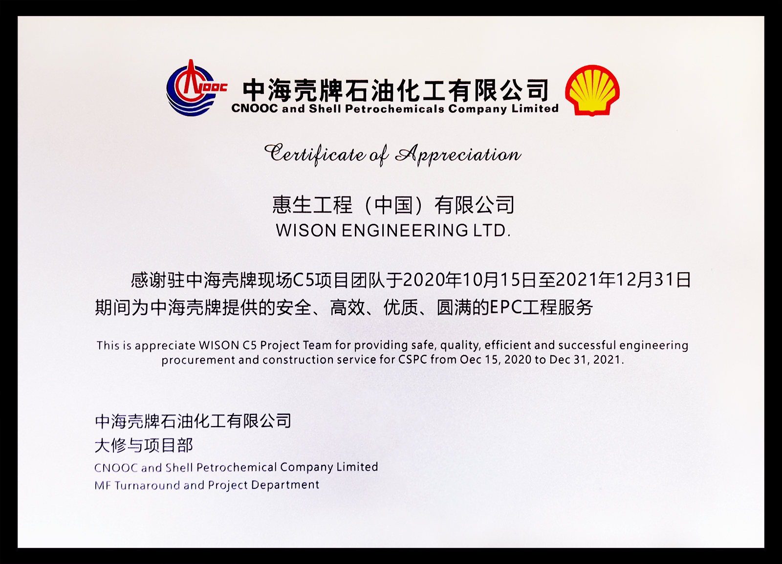 2021年12月31日,惠生中海壳牌(一期)低碳烯烃装置汽油加氢单元改建项目部收到业主的感谢牌,以感谢惠生为中海壳牌提供的“安全、高效、优质、圆满的EPC 服务”