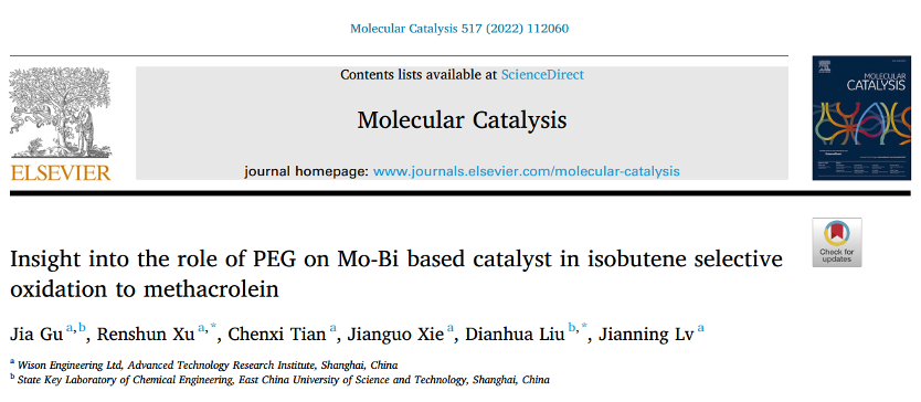 近日,惠生工程新技术研究院顾佳、徐仁顺、田晨曦、解建国等人撰写的论文《Insight into the role of PEG on Mo-Bi based catalyst in isobutene selective oxidation to methacrolein》被《Molecular Catalysis》杂志接受发表(Molecular Catalysis, 2022, 517, 112060, IF=5.062, 二区),徐仁顺、刘殿华为通讯作者,顾佳为第一作者。