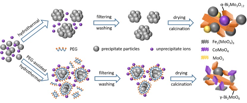 论文指出,异丁烯选择氧化生成甲基丙烯醛(MAL)是甲基丙烯酸甲酯(MMA)生产工艺至关重要的一步反应,催化剂的性能决定了MMA的品质与产量。该研究采用PEG辅助水热法制备一系列Mo-Bi系复合氧化物催化剂。PEG在制备过程中不仅能够与金属离子络合,减少催化剂中Co和Cs元素的流失,而且能够包裹颗粒,抑制颗粒团聚,细化催化剂颗粒尺寸,还能够削弱催化剂酸性,优化活性组分结构。将催化剂应用于异丁烯选择氧化制MAL反应中后发现PEG的添加能够显著提高MAL的选择性,从77%提高至91%。