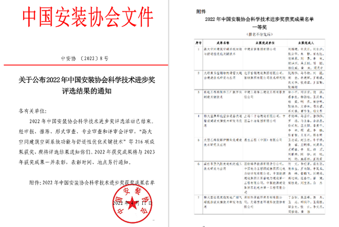 中国安装协会科学技术进步奖与中国石油和化学工业联合会科学技术奖同为国家科学技术奖励序列,为全行业安装工程最高科技进步奖项,由中国安装协会设立承办,评选周期为两年一届。2022年度中国安装协会科学技术进步奖评选于2021年12月启动,共有460项成果参与申报,最终共有216项成果获一、二、三等奖。