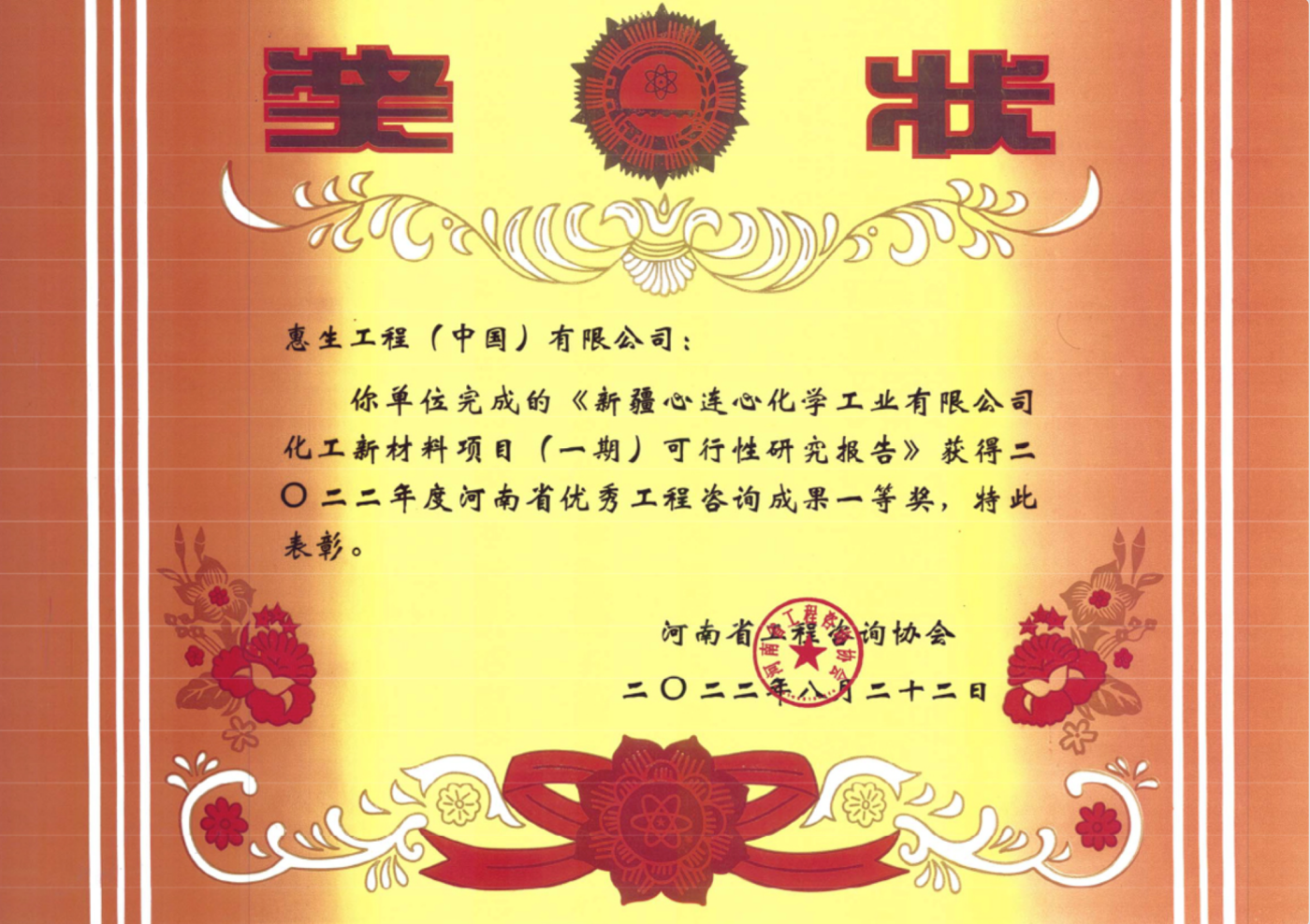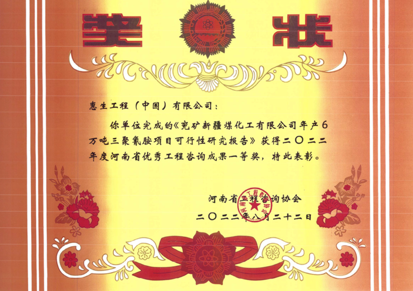 近日,2022年度河南省优秀工程咨询成果奖获奖项目名单隆重公布,惠生工程(中国)有限公司参评的《新疆心连心化学工业有限公司化工新材料项目(一期)可行性研究报告》、《兖矿新疆煤化工有限公司年产6万吨三聚氰胺项目可行性研究报告》荣获一等奖。