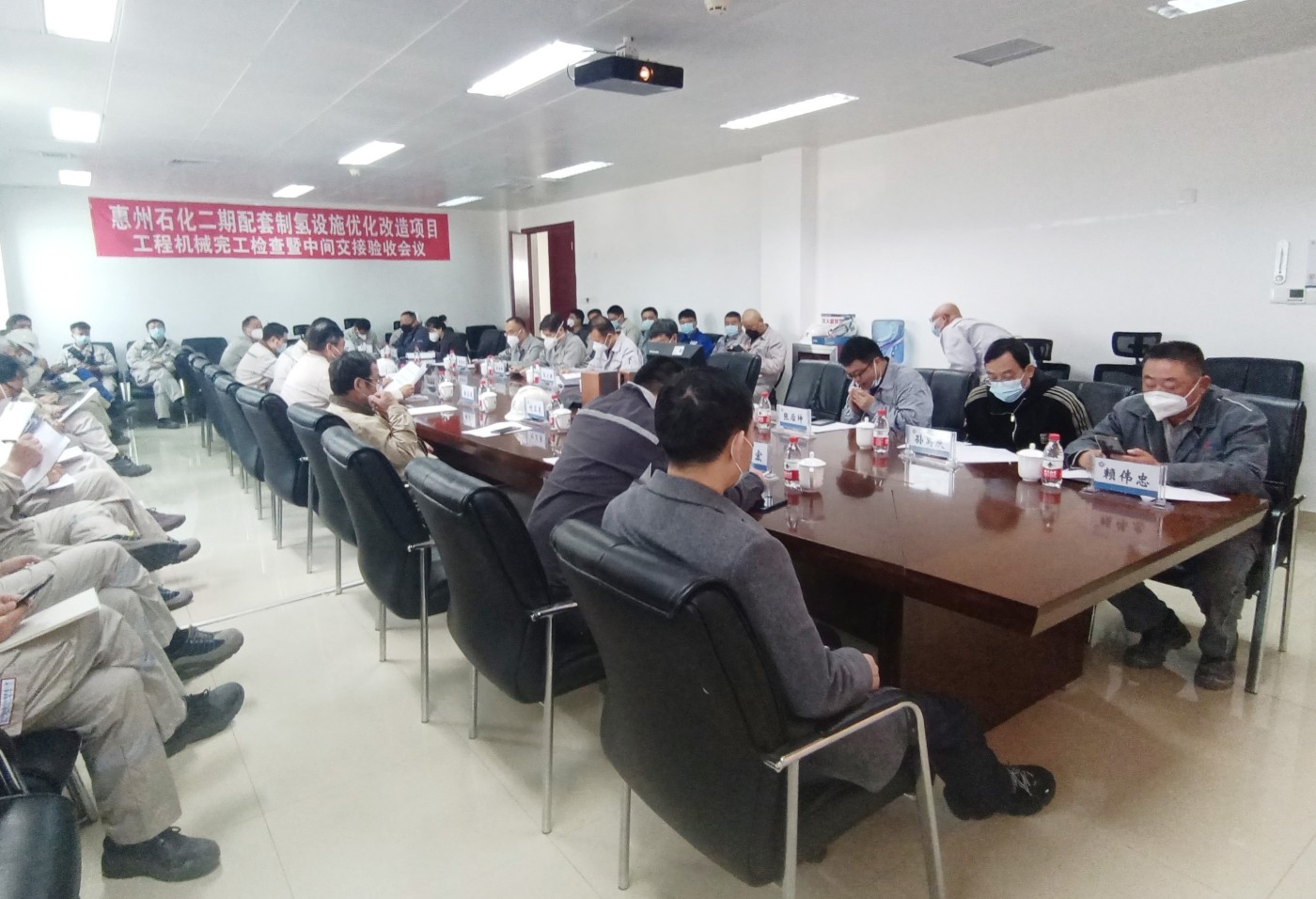 本工程机械完工检查暨中间交接验收由业主组织,专家组、质量监督站和各参建方与会,主要进行了现场检查验收、资料审查和专家组评审等议程。期间,我项目执行经理赖伟忠总在首次会议上做了有关“设计、采购、施工情况”的汇报。大家通过一整天的共同努力,最终顺利完成全部预定流程,签署了中间交接证书。
