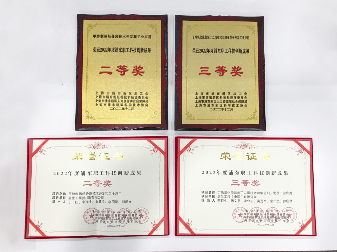 近日,由上海市浦东新区总工会、浦东新区科技和经济委员会、浦东新区人力资源和社会保障局、浦东新区科学技术协会联合举办的“2022年度浦东职工科技创新成果”评选结果揭晓,惠生工程申报的《甲醇制烯烃分离技术开发和工业应用》和《丁烯氧化脱氢制丁二烯技术和催化剂开发及工业应用》项目,分别荣获二等奖、三等奖。