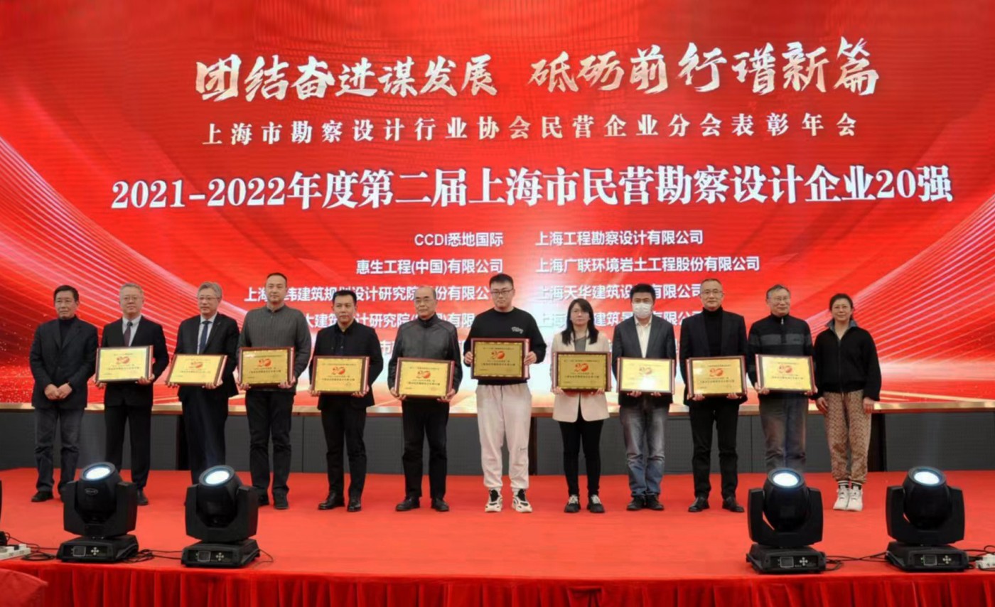 3月1日,在由上海市勘察设计行业协会指导,上海市勘察设计行业协会民营企业分会主办的“团结奋进谋发展,砥砺前行谱新篇——协会民营企业分会第三届第一次会员代表大会暨民营企业分会表彰年会”上,惠生工程以排名第二的成绩蝉联上海市民营勘察设计企业20强,公司总裁周宏亮出席大会并上台领奖。