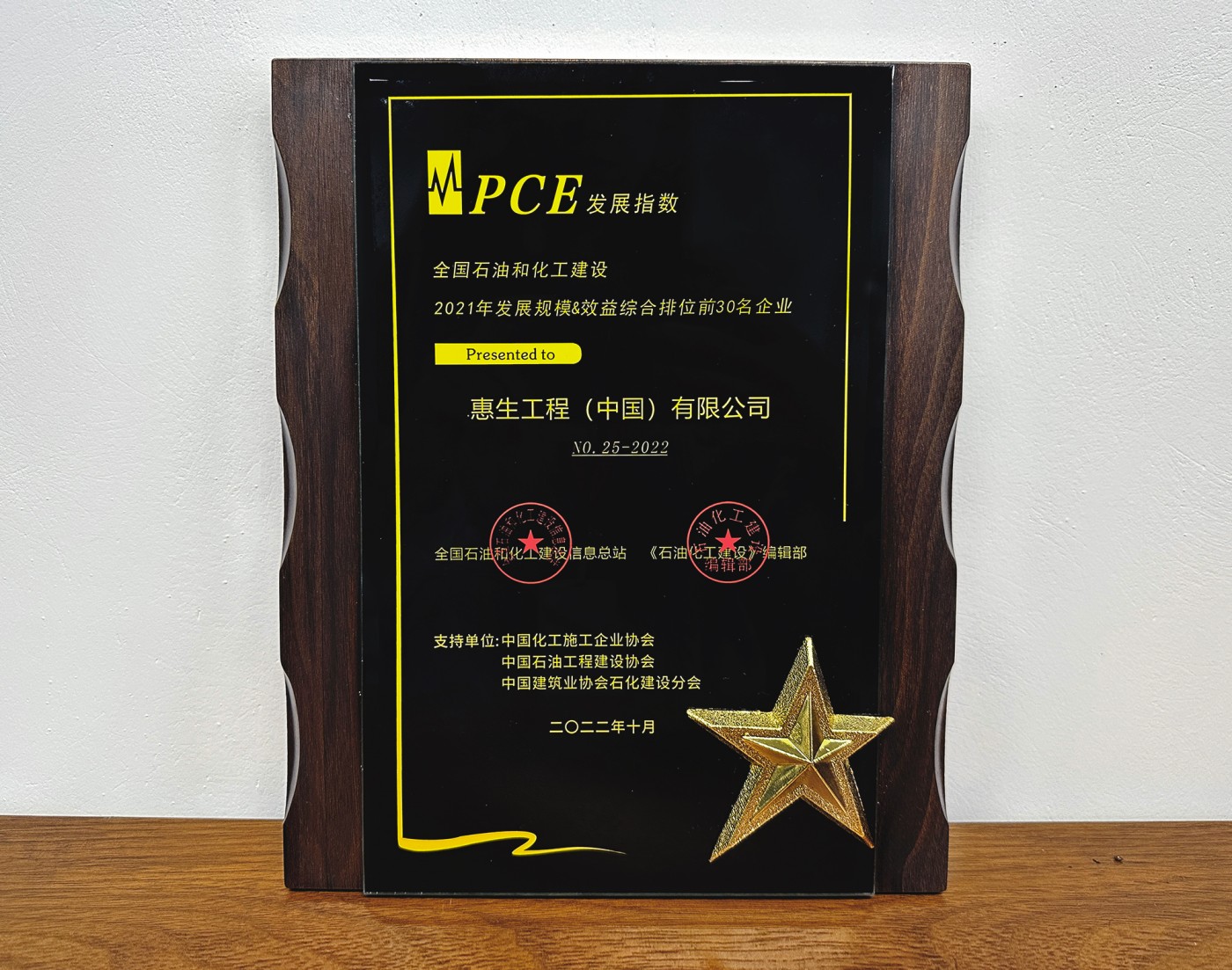 为了在更大范围内树立标杆,进一步促成相关行业企业的相互学习和交流,中国化工施工企业协会联合了中国石油工程建设协会、中国建筑业协会石化建设分会和全国石油化工建设信息总站开展了“全国石油和化工建设行业年度规模&效益(PCE指数)排位”,统计产生了2021年度全国石油和化工建设PCE指数前三十位,惠生工程位列其中。