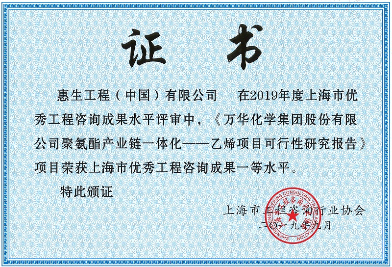 在2019年度各省级优秀工程咨询成果奖评选活动中,惠生工程(中国)有限公司总计荣获一等奖2项、二等奖3项、三等奖5项,获奖数量创历史新高。其中《万华化学集团股份有限公司聚氨酯产业链一体化——乙烯项目可行性研究报告》、《新疆心连心能源化工有限公司二期年产6万吨三聚氰胺项目可行性研究报告》荣获一等奖;