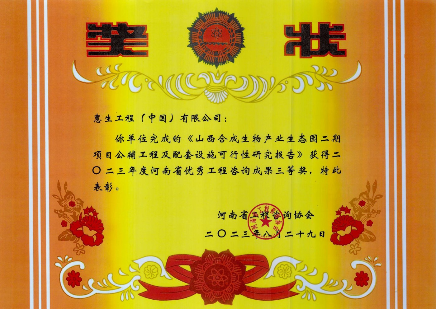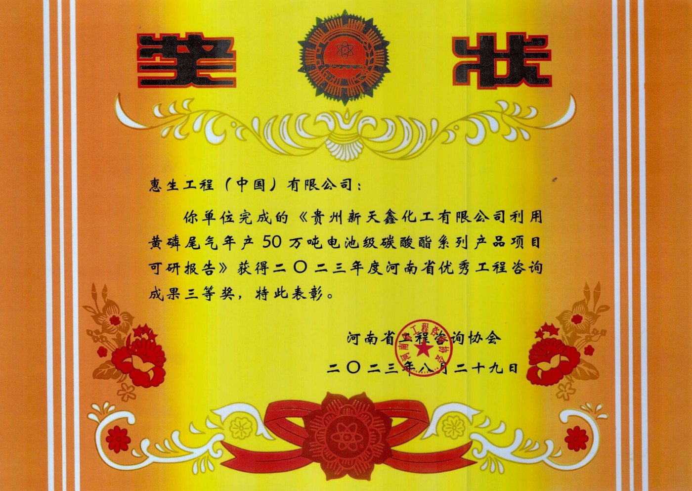 优秀工程咨询成果奖是咨询行业为了表彰工程咨询领域内取得杰出成绩和卓越成就的单位和个人,是对咨询单位工程咨询水平的肯定。2023年,惠生工程在工程咨询领域取得的成绩说明公司坚持的高标准、严要求取得了实效,公司的咨询水平得到了行业的认可。期待未来惠生工程的咨询业务能在更广阔的领域取得更大成就,有力推动公司市场的拓展和业务的推广。