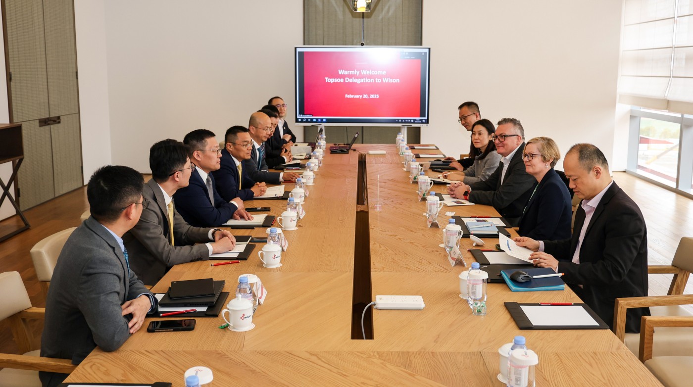 2月20日,丹麦托普索公司全球化工技术转让总监Leigh Samuel Taylor、全球EPC战略合作负责人Carron Marie Freeney一行莅临惠生工程访问交流。惠生工程总裁周宏亮、CTO刘恒伟、副总裁吕建宁,以及产品技术中心、设计中心、市场部等部门主要人员出席了会议。双方围绕能源转型,在绿色氢氨醇、可持续航空燃料等系列低碳技术领域展开充分探讨,针对全球新能源项目工程协同机会进行深入交流,并就携手助力全球绿色转型发展达成共识。