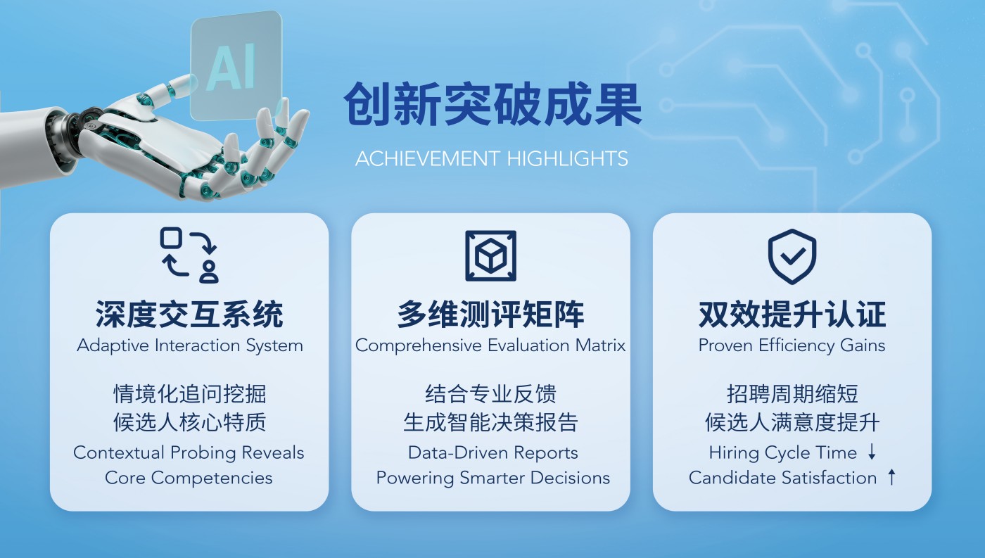 在整个改变过程中,如何避免把AI服务当成简单的人机对话的陷阱,而是能否让其发挥深度交互和多维测评的作用,一直是此次AI赋能中,工程HR团队努力的方向。通过强化招聘团队对于岗位能力需求的理解,持续优化AI系统对于专业能力的自然反馈,提高了AI服务追问和发掘候选人潜在特质的能力,从而让AI虚拟面试官在面对特定候选人群体时,能够有效开展针对性面试,并提供多维度测评报告,为面试最后决策提供辅助;同时,也收到了候选人的积极反馈。