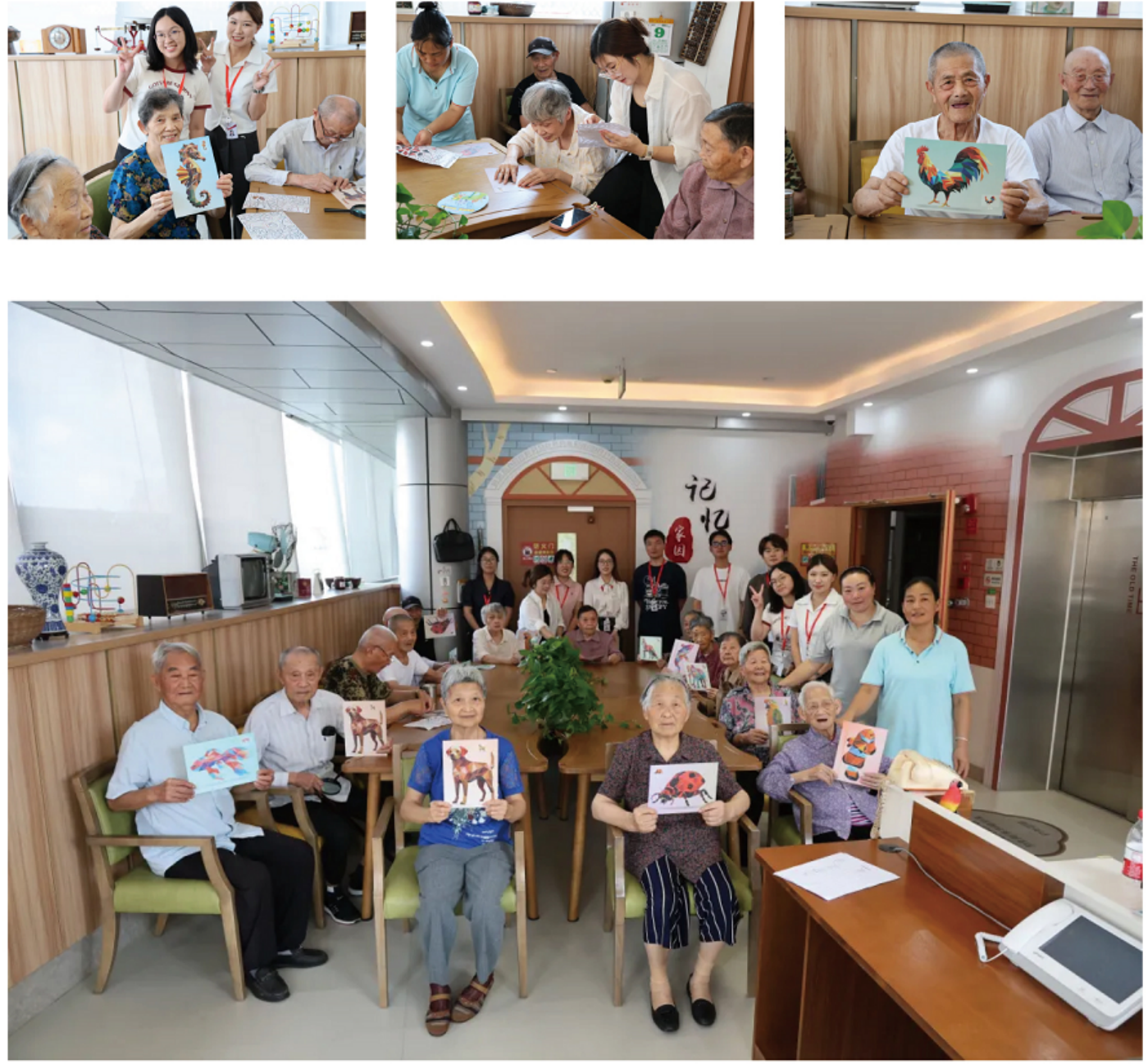 巧手拼贴乐享时光:志愿者们耐心陪伴,与老人们一起挑选彩纸、拼贴图案。手指在纸片间穿梭,一幅幅充满童趣的作品逐渐成型,成为长者们手中温暖的礼物。