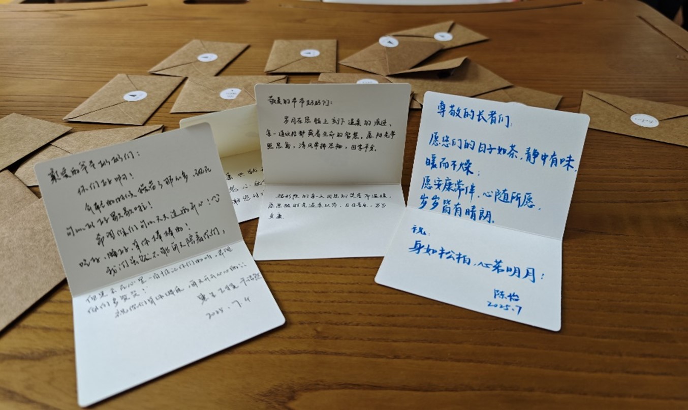 孙桥养老院成立于2003年,主要照料高龄失能失智老人,随着周边老龄化加剧,养老院的设施和陪伴需求日益增长。活动前夕,惠生工程深入养老院实地了解需求,得知部分空调老化失效,公司迅速响应采购爱心空调,解决老人夏日酷暑之忧。同时,精心筹备手工拼贴画材料、趣味照片拍摄道具等互动物资,只为给长者们带来一个难忘的午后时光。无法亲临现场的校招同学,也纷纷写下祝福卡片,将心意传递。