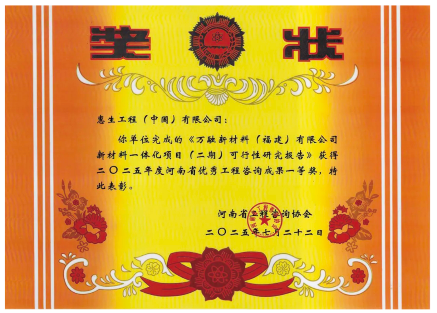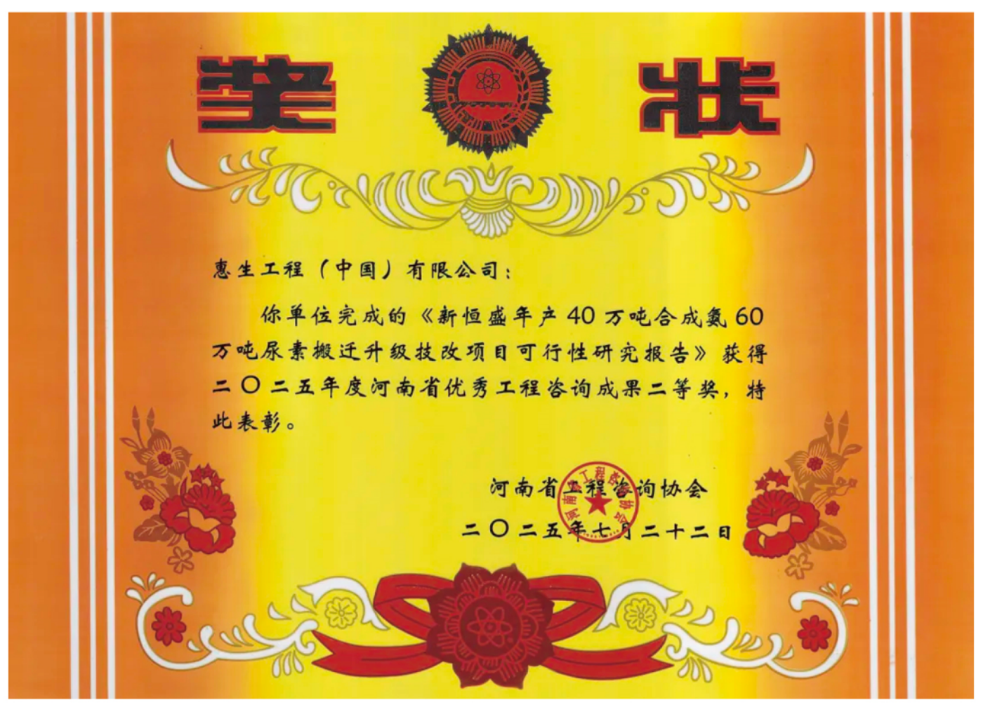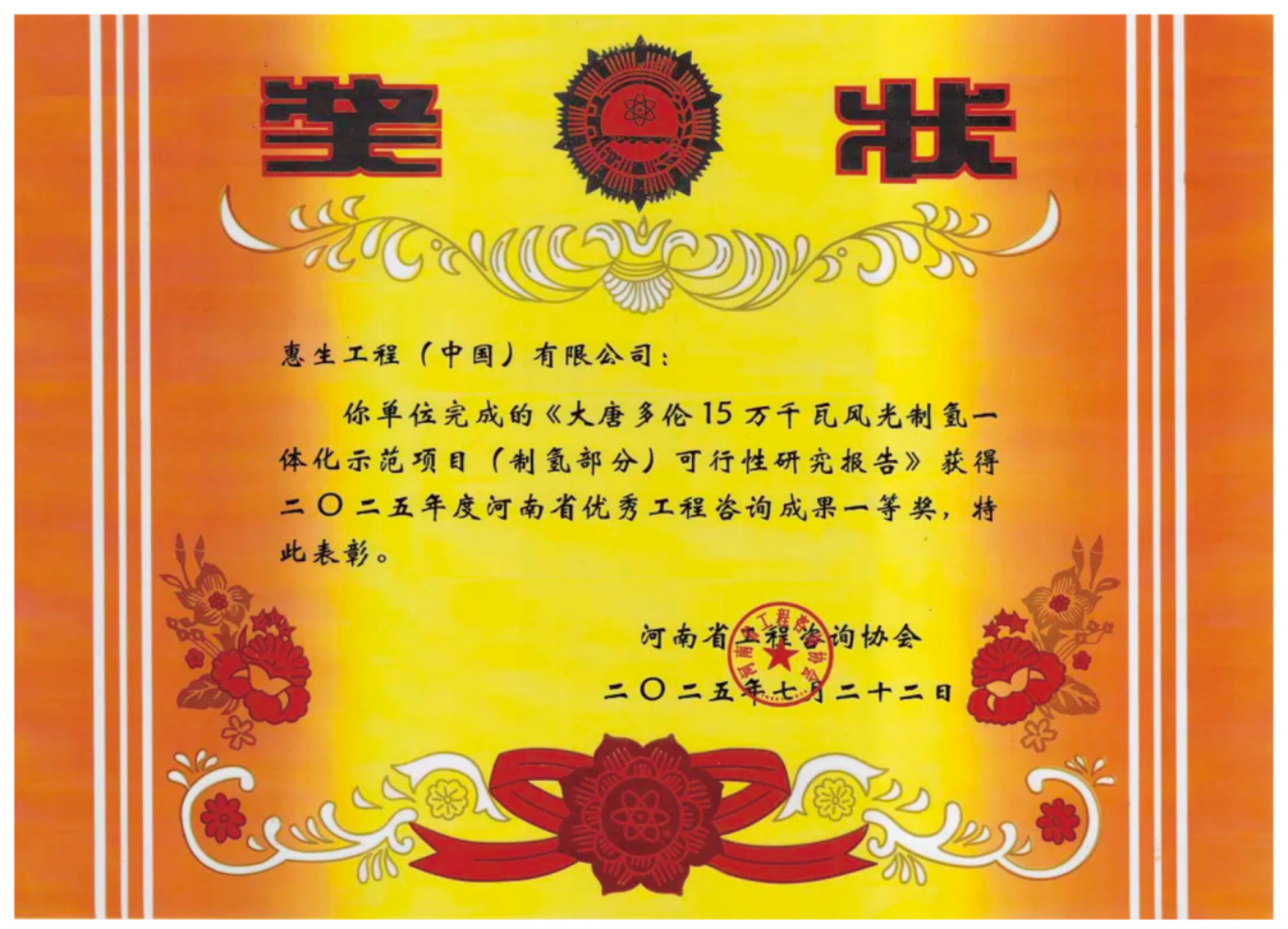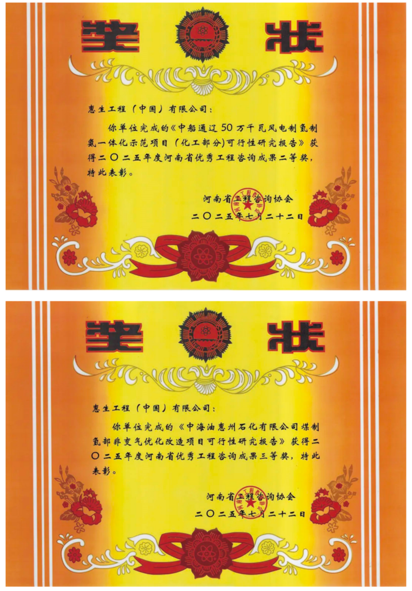 在河南省工程咨询协会组织的“2025年河南省优秀工程咨询成果”评选中,惠生工程表现突出,荣获一等奖2项、二等奖2项、三等奖1项。其中,《万融新材料(福建)有限公司新材料一体化项目(二期)可行性研究报告》、《大唐多伦15万千瓦风光制氢一体化示范项目(制氢部分)可行性研究报告》荣膺一等奖。