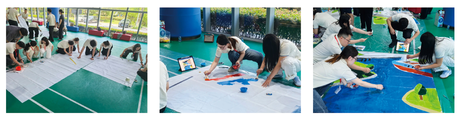 开营首日下午,一场别开生面的“纳斯卡巨画”主题活动在羽毛球场热烈展开。新生们以小组为单位,亲手描绘惠生工程引以为傲的核心产品图景。从铅笔线稿的精细勾勒,到油彩上色的浓墨重彩,组员们分工明确、协作无间:测量、勾线、调色、涂绘、修饰,每一笔都凝聚着专注与匠心。最终,各小组精心完成的画板严丝合缝地拼合,呈现出一幅展现惠生核心实力与创新精神的画卷。这不仅是团队协作力量的生动诠释,更是新惠生人对公司核心业务的初体验与情感共鸣。