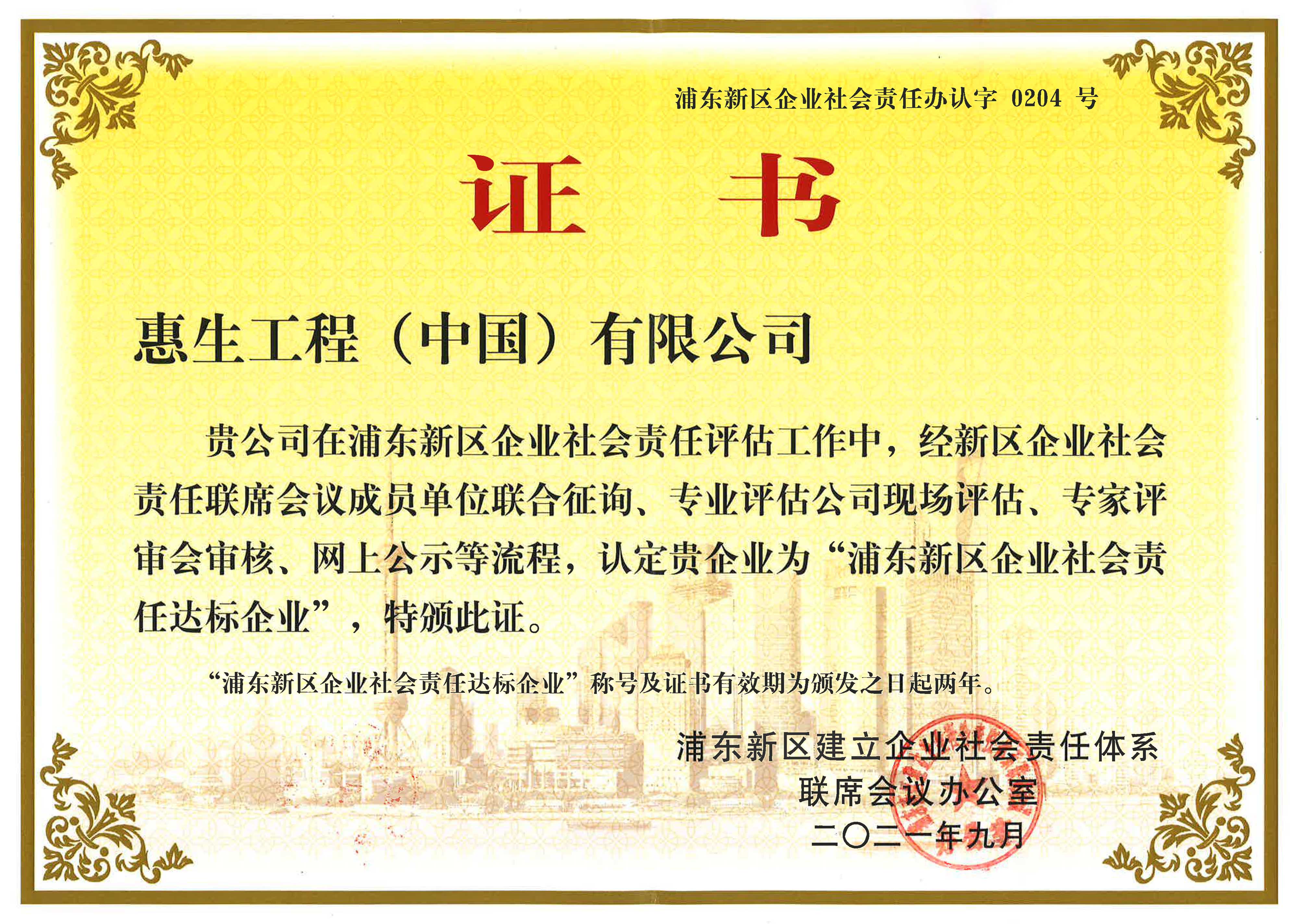 2021年9月28日,在“2021年度浦东新区企业社会责任达标企业颁证及座谈会”上,上海市商务委、浦东新区建立企业社会责任体系联席办向惠生工程正式颁发“浦东新区企业社会责任达标企业”荣誉证书,充分肯定惠生工程积极履行社会责任的卓越表现。